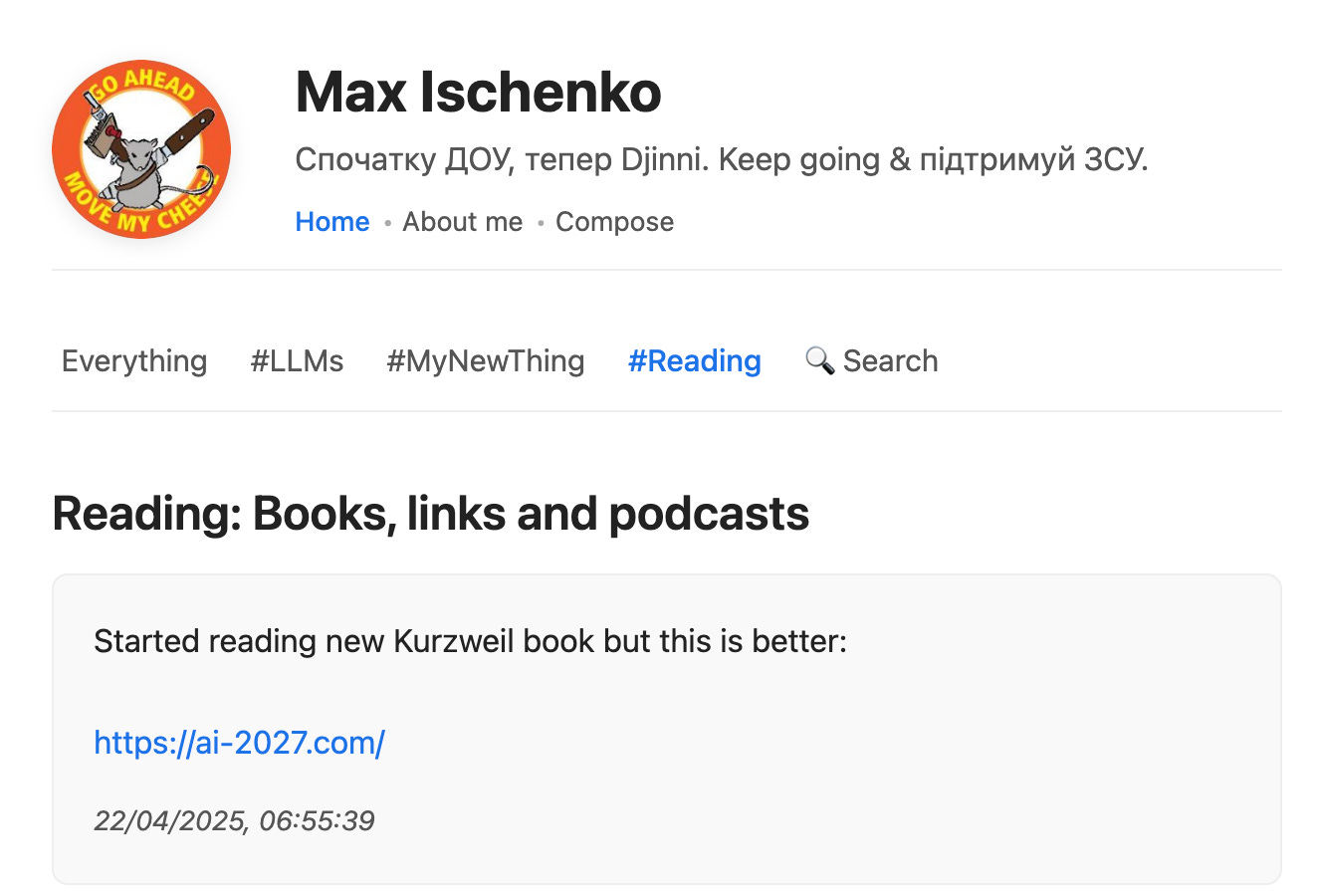 Мій новий блог :-)Max IschenkoApr 22, 202521Share.. зроблений разом з моїм ко-розробником LLM.https://maxua.com/Не знаю куди він мене заведе, але дуже цікаво. Let’s how deep this hole goes.Підписатися можна по імейл (форма в футері), Telegram або Bluesky.